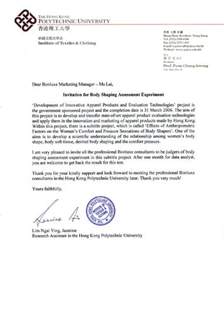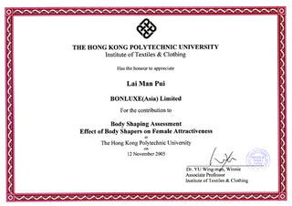 "Development of Innovation Apparel Products & Evaluation Technologies (2003 – 2006)" studies the further development and transfer of the latest apparel product evaluation technologies to the textile and garment industry. This project is sponsored by the Innovation and Technology Commission of the Hong Kong Government, The Hong Kong Polytechnic University, Bonluxe and the Hong Kong textile and apparel industry jointly participated in the funding.